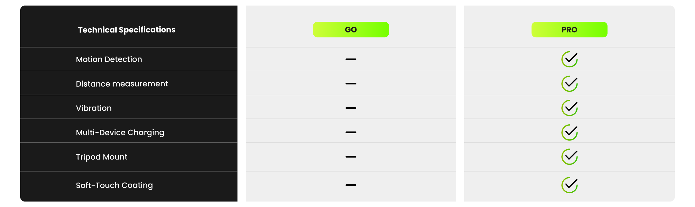 *Go model does not include motion detection, distance measurement, and vibration features.